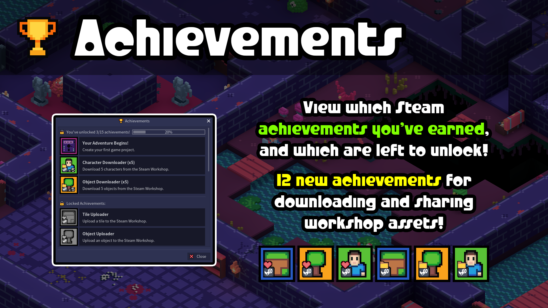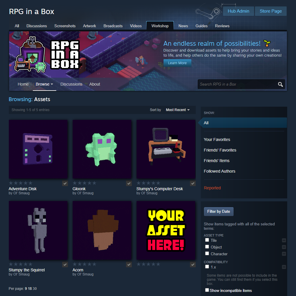 I'm so excited to present RPG in a Box 1.3: The Workshop! This huge release brings Steam Workshop support to RPG in a Box, along with more achievements, a retro effect, GIF support, OBJ importing, screen shake improvements, a new "Inn" feature for chatting with your Steam friends, and many other updates and fixes! Read the full release notes here: https://rpginabox.com/forum/d/1067