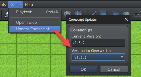 Update your project by going to the Main Tool Bar -> Game -> Update Corescript option.