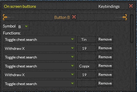 Parameters to on screen buttons Examples: Buy X, Withdraw X - can set the x amount value. Toggle chest search - can also set the search value Example: getting bronze bar materials with 1 click Adding more than 5 functions to a single button requires premium. Premium is limited to 9 functions.