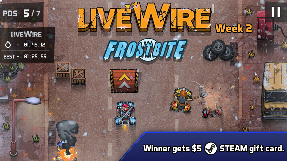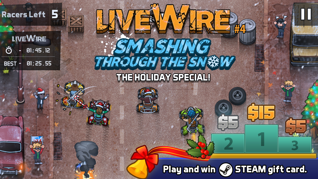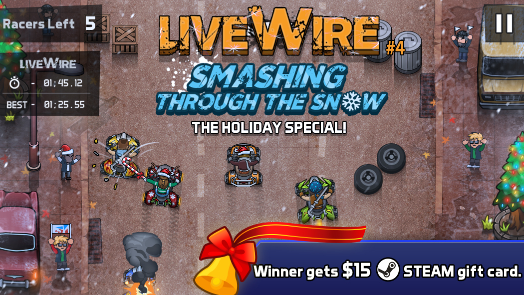 It's freezing out there but we've got some hot news for you- we are extending the duration of the holiday special LiveWire event- Smashing Through the Snow- by 4 days and instead of only giving a $15 Steam Gift Card to the user who tops the leaderboard, we are giving our $5 Gift Cards to the second and third places too!