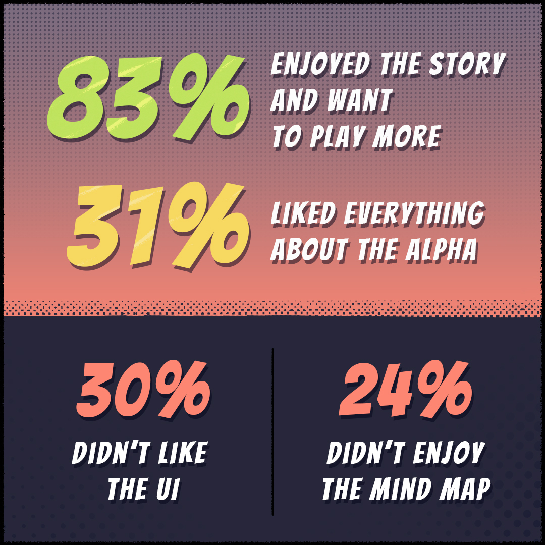 83% of you enjoyed the story so far and look forward to exploring more of Rue Valley in the future. 31% of you liked everything about the alpha. 30% thought the UI was the least enjoyable aspect of the game, and 24% didn’t enjoy the Mind Map. Don’t worry, though; we are already working on improving these aspects of Rue Valley!