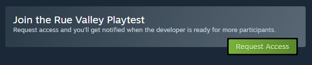 You’ll see a ‘Join the Rue Valley Playtest’ box with a ‘Request Access’ button. Press this button and confirm that you want to participate. After that, Rue Valley Alpha will appear in your library, and you’ll be able to install and play it until the end of the playtest.