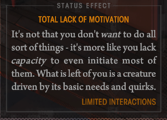 While this specific status effect does not change your personality in any way it most certainly affects your progress as your character is just not motivated enough to perform certain actions (as indicated by the all caps orange letters that say “LIMITED INTEARACTIONS”). So until you manage to find something that motivates you, you are stuck fulfilling only your basic needs which are usually just quenching your thirst or finding a bed comfortable enough to take a nap.
