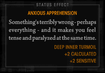 Unlike Total Lack of Motivation, Anxious Apprehension actually modifies your personality. It occurs when your character becomes anxious when certain events happen. You become more sensitive and more careful when making decisions.