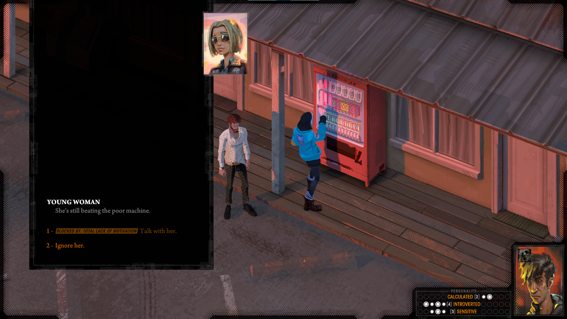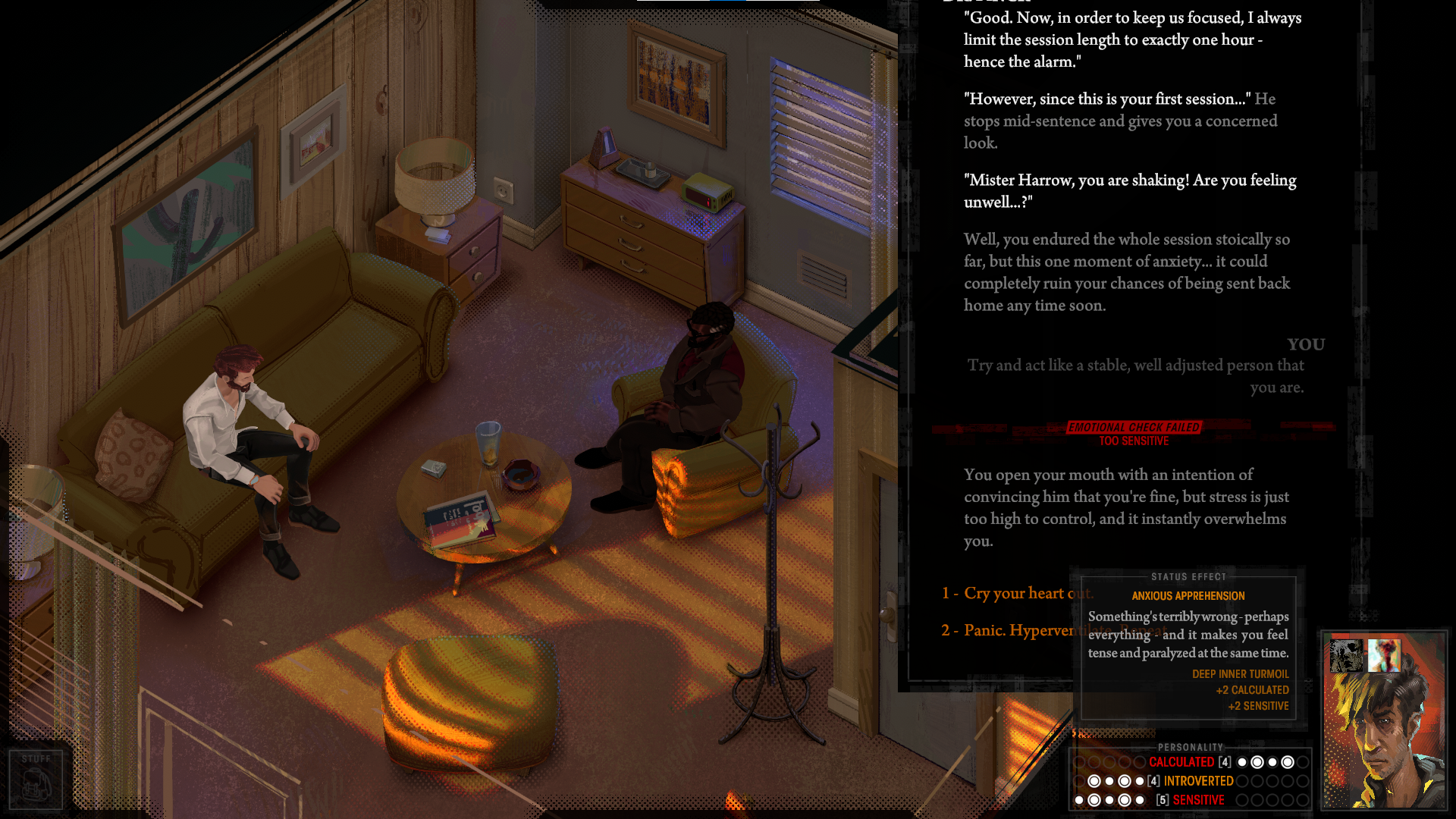 Right at the start of the game, your character suffers from a Total Lack of Motivation. It is the first thing your therapist notices and very soon you encounter a dialogue option that is grayed out and blocked by that status effect.