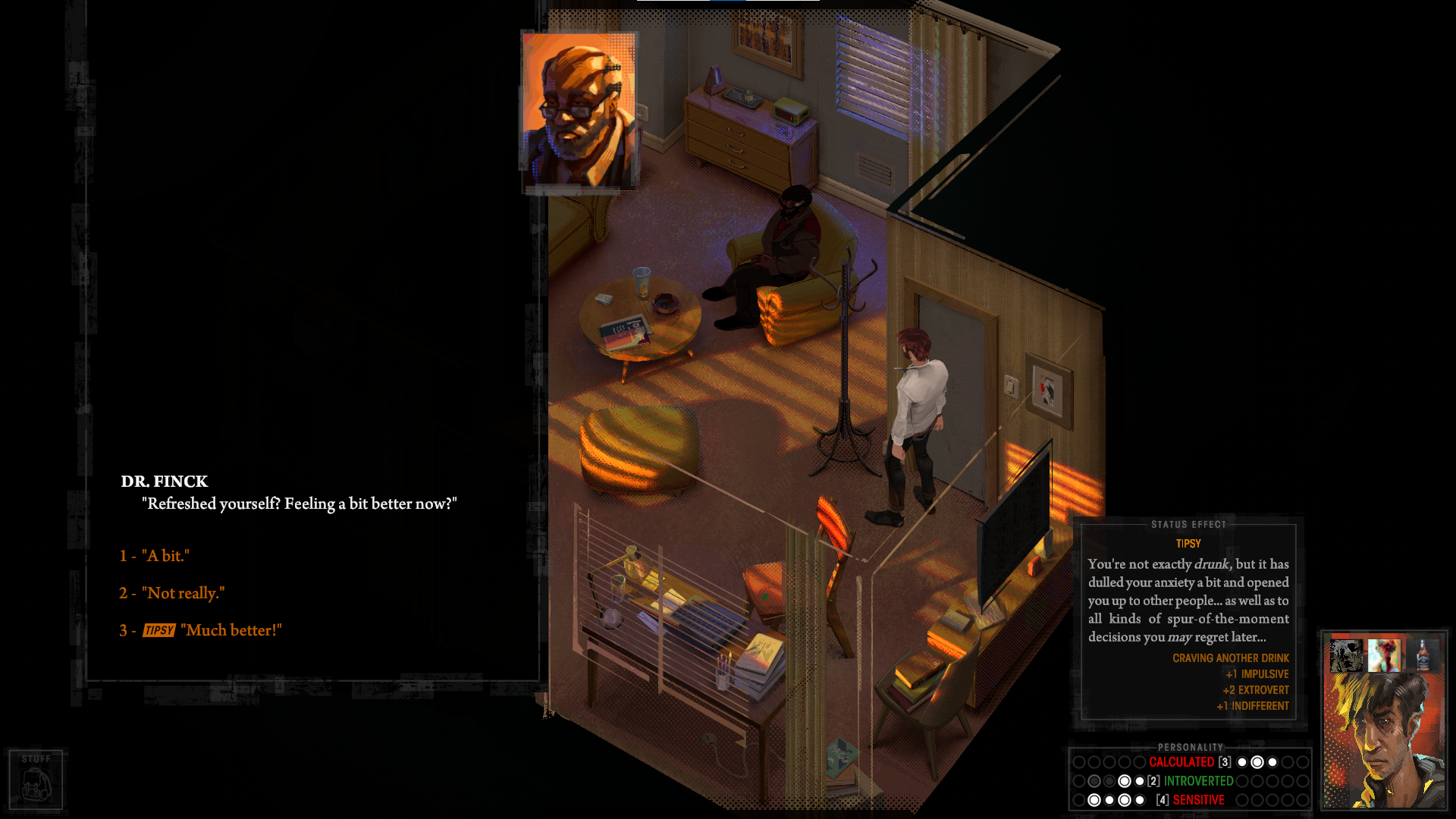 Multiple status effects stacked together making you a completely different person. Also Tipsy status effect gives you an extra answer to the therapist’s question.