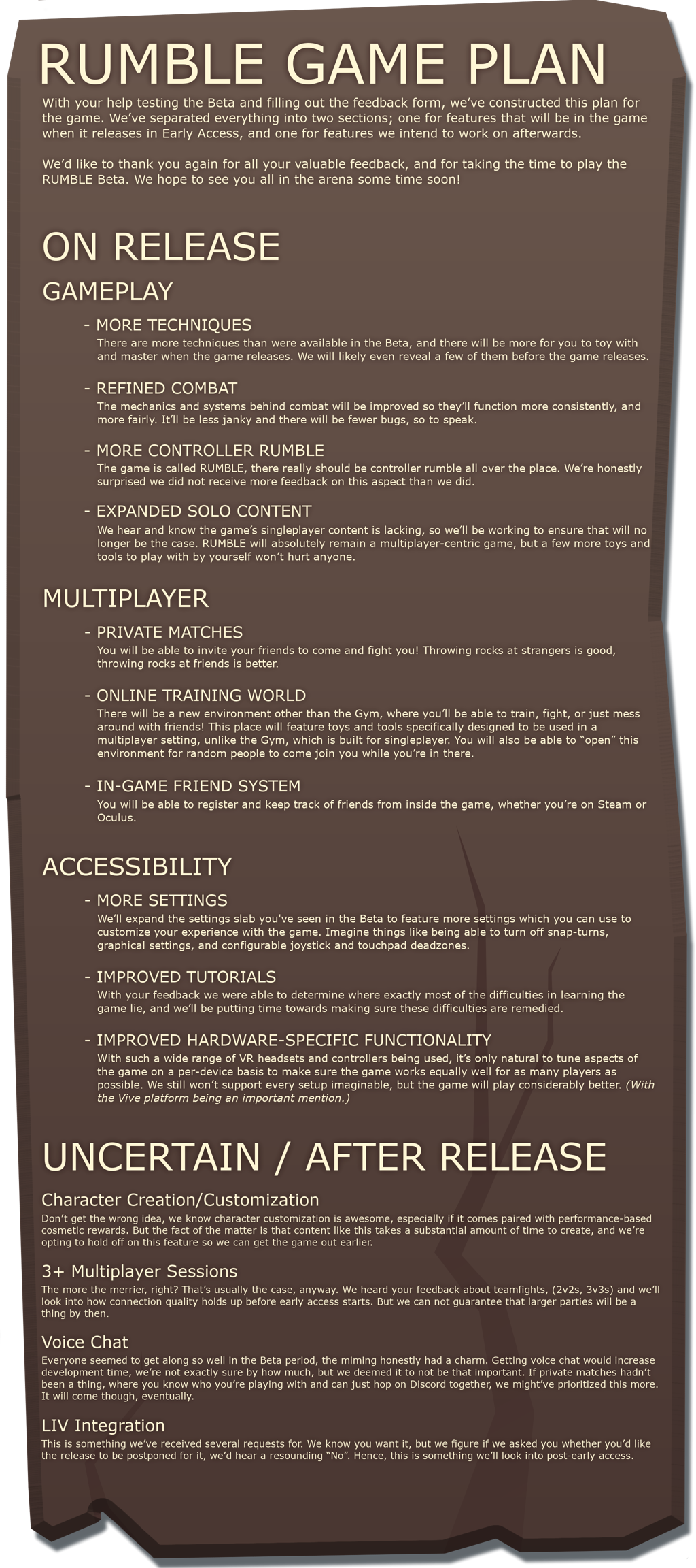 We've attached an image with details about which details about what you can expect to see when RUMBLE releases in Early Access, and what will come after.