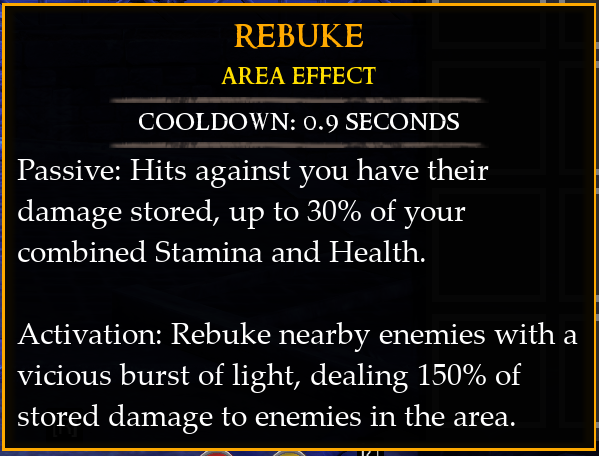 Scorn - Grants the Rebuke skill. Rebuke Passive: Hits against you have their damage stored, up to 30% of your combined Stamina and Health.