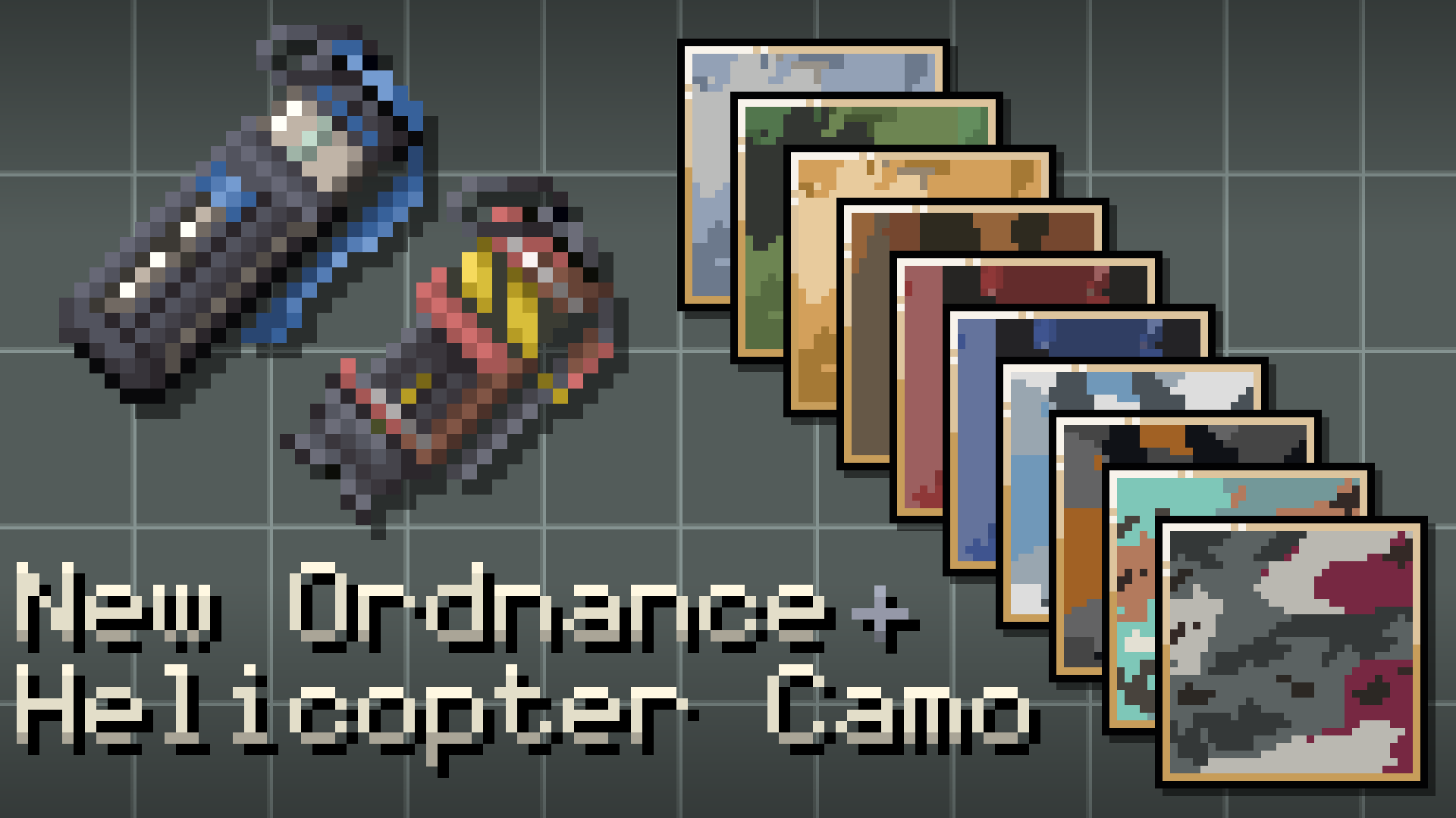 Continuation on the features showcased in the "Ember" Devlog entry. Helicopter Camo can now be changed, select between 14 variants, and two new ordnace items; EMP Grenade and Incendiary Grenade.