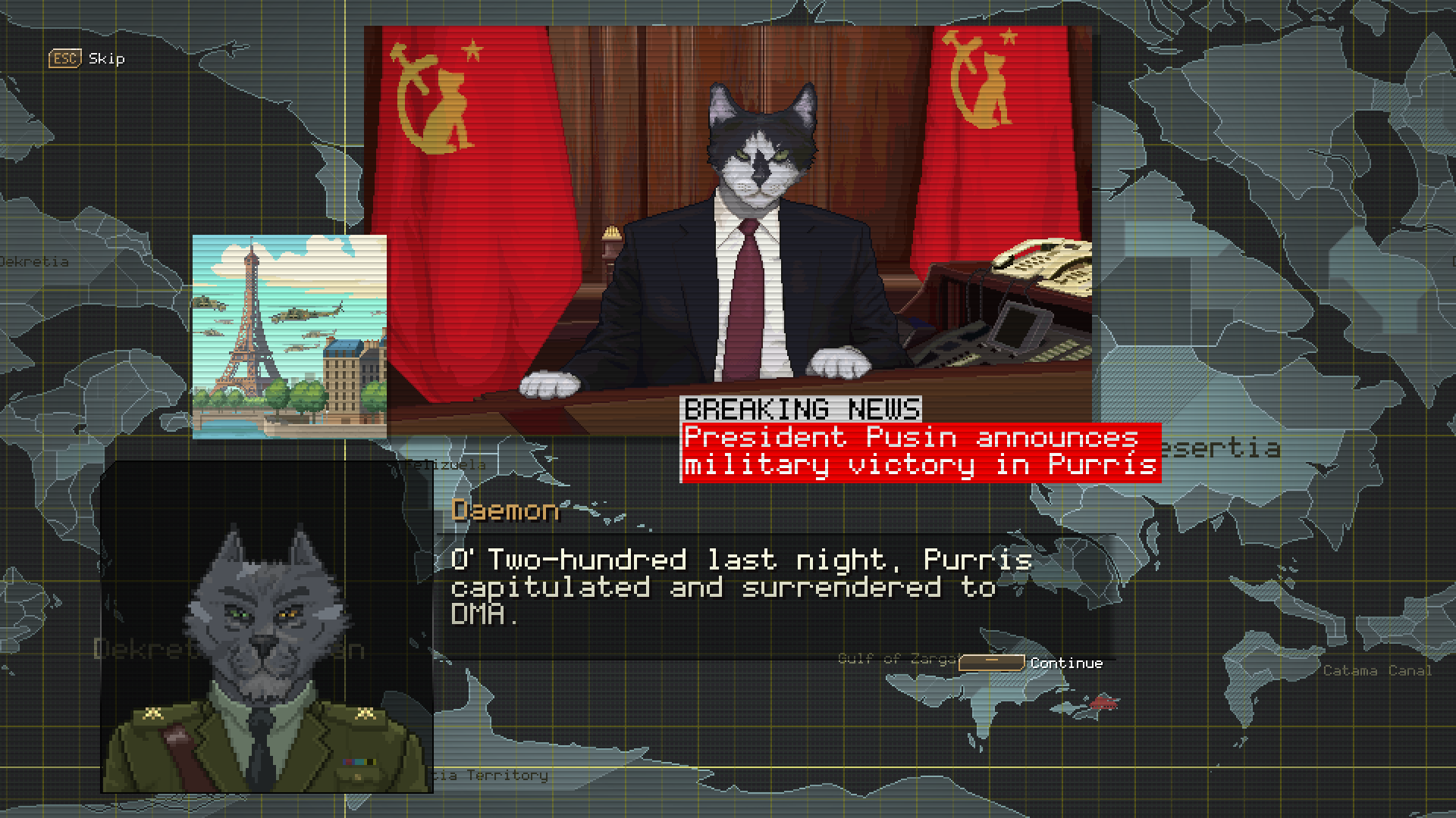 Emerald was a project-name from the start, and in Rushaug's current state; Feline Warfare reflects the game's theme and identity far more. After all, the game is about a world in conflict, inhabited by cats. Rushaug is becoming more and more a satirical depiction of human conflict throughout the last hundred years. Cats fighting over the colour of their flags, the patterns on their fur, political and societal systems. Some people have been asking for updates, wondering about progress being made, and I am confident this trailer have been a clear indication to how far the game has come. I am very proud of this trailer, and it's been very gratifying for me to see my work finally showing.