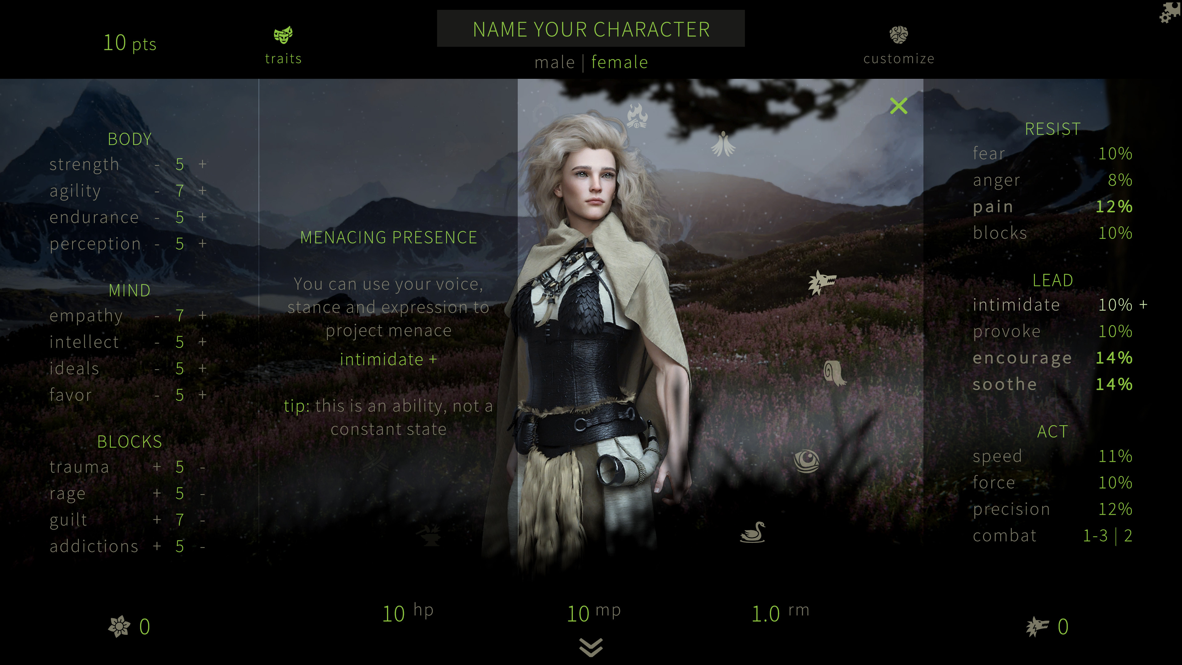 Currently, the game already enables players to spend their motivation on keeping their fear and anger low, so as to not negatively affect NPCs. We realized that the 4 “presence” traits from the character creator could also be used to make a difference in these situations.