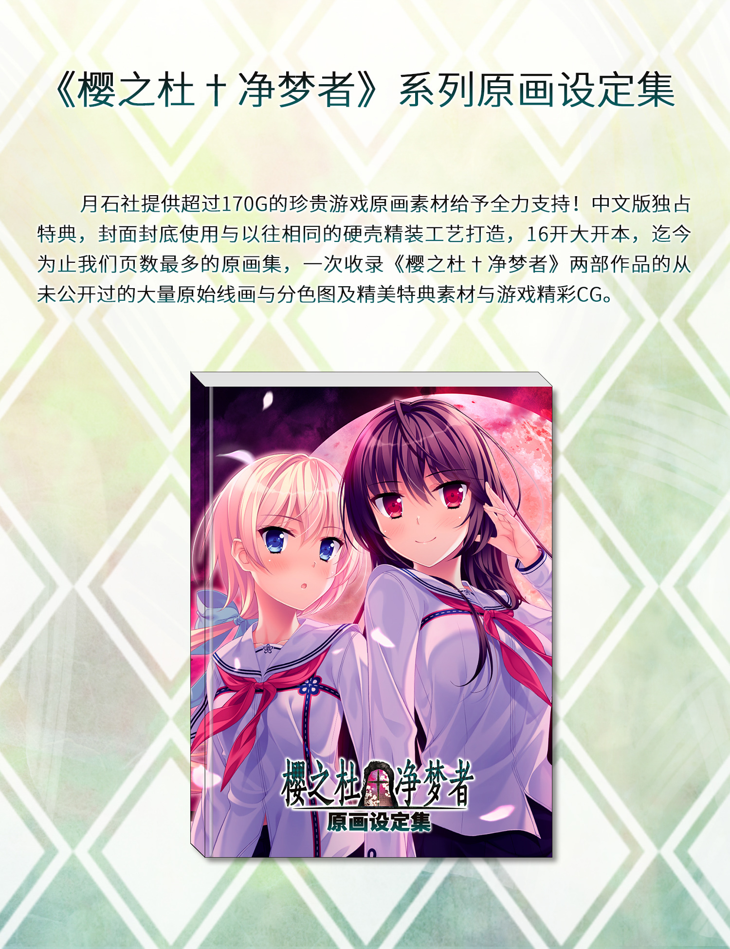 本次活动我们为大家带来了多个为中文版玩家独占打造的精美周边,170G原画素材独家打造超大分量设定集!抢先收录日本未发行全新主题歌的原声集!为中文版专门准备的全新旗袍主题画师签名色纸与泳装主题精美挂画!还有答谢首周支持与回报长期支持的限定特典,机不可失!今日我们也将携手月石社为《樱之杜†净梦者1》带来重大更新。