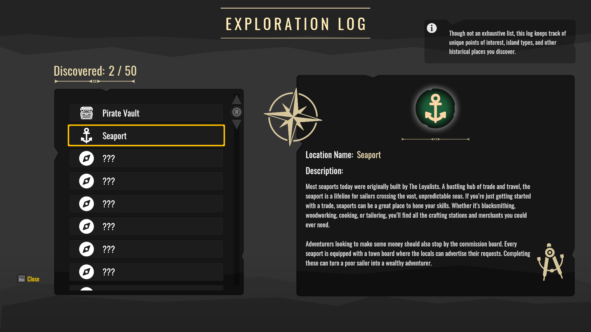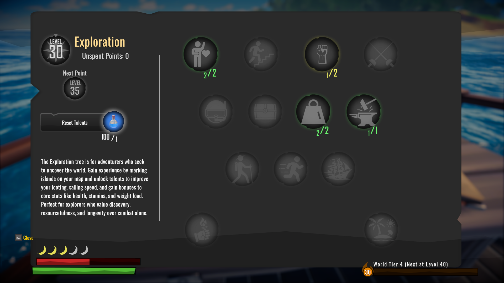 In the next patch we're including a brand new skill tree related to exploration. As you discover new islands, you'll earn experience towards your exploration skill, unlocking new talent nodes on your exploration skill tree. These skills will have various effects like increasing your sailing speed, more weight capacity, extra materials when salvaging, and more.