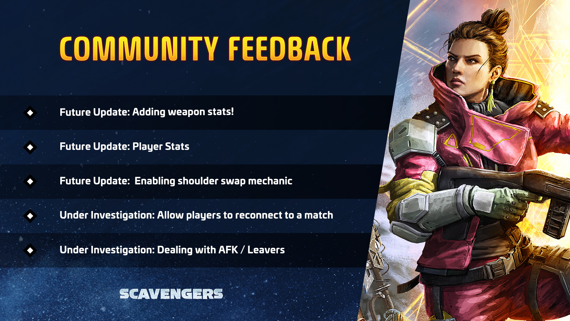 So, every week, we'll share our thoughts on some of the top community feedback topics that we’ve been seeing on our platforms. We may work on some of these for a future update; some of these could be part of a long-term plan and might not have a date for when they’ll arrive in Scavengers. Others, we may be investigating or considering adding, but can’t promise that you’ll see them in the game. Finally, for some, we want to continue hearing your feedback and thoughts on, to ensure we’re considering the right way to approach it. Let’s break them down: