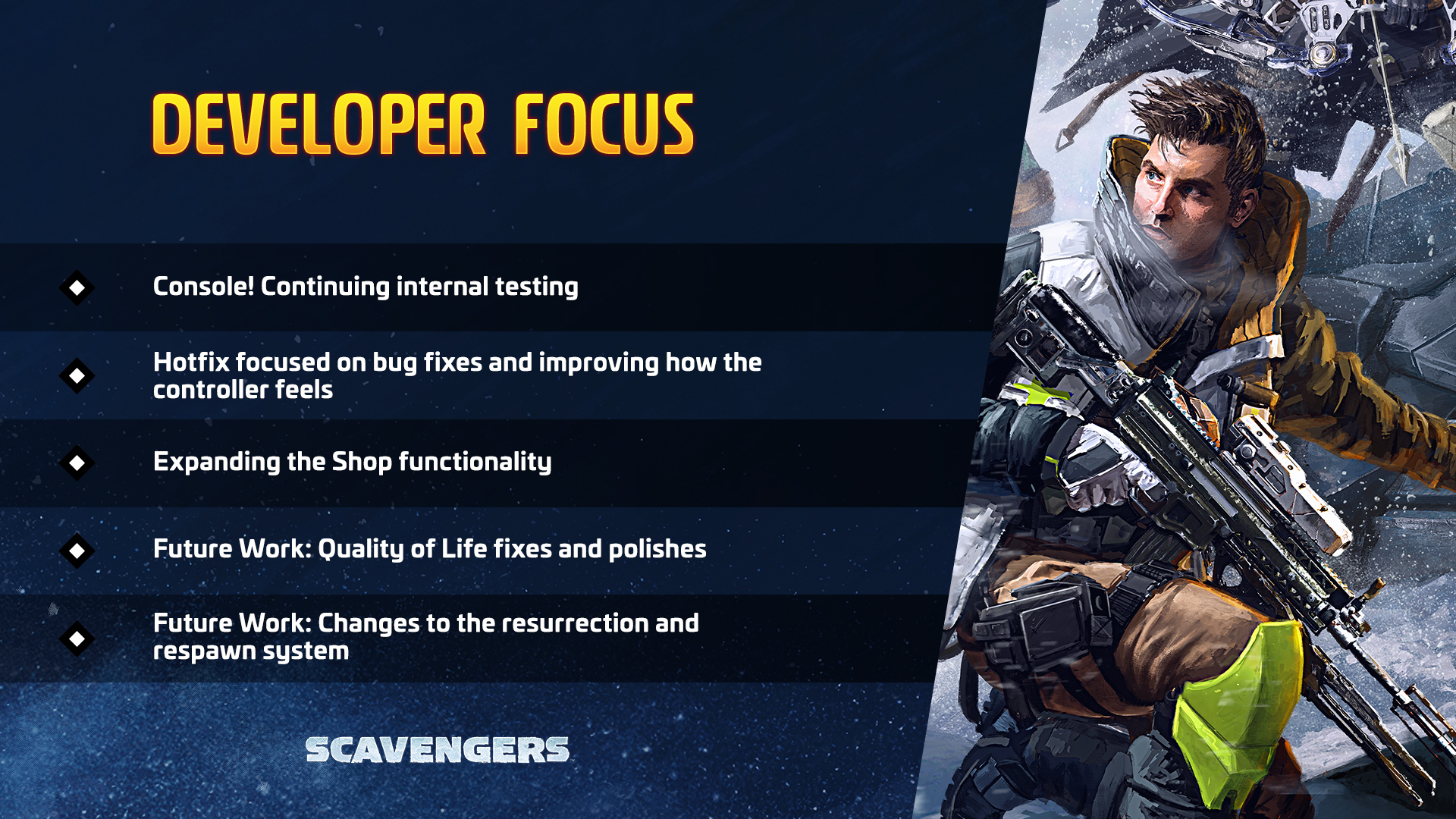 Player Retention: Another continuing focus for us is to improve our player retention.. We want Scavengers to be a game that players are excited to return to, time and time again and we’ll be working on this through systems for both new and experienced players.