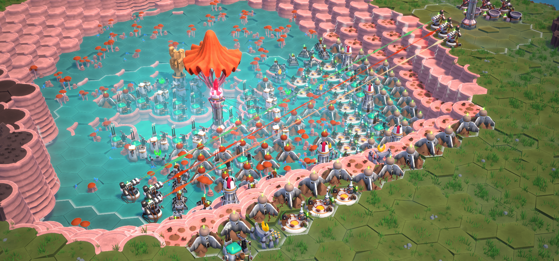 Each new biome introduces a couple of new twists to the city building. You will have to plan around the shape of resource veins, the terrain itself, establish logistic connections between colonies in other biomes and master the production of newly unlocked types of products and finally scale up your infrastructure.