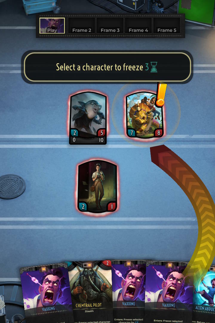 The A > B > C > A pattern gives a clear sense of what outcomes you can expect when your actions collide with your opponent’s actions, you still have to know where that action will come from or where it will land. You can dodge an attack or trope with a single action, but if your opponent figures out what character you’re protecting, they can just attack someone else letting your dodge whiff, squandering your precious frames. If you have spotlight and are positive you know where an attack is coming from, even if you don’t know where it is going, you can try to cut it off with a counterattack. And this is all just the three basic actions of the game; as you start layering effects from tropes, crew, and character abilities, you can see even more complex gameplay that emerges from this set of basic interactions. If your opponent tries to pounce by attacking your frozen character, you could have a trope of your own to freeze their character and cut off its attack. If your opponent thinks your empty board is a ripe target for some easy narrative by performing, you can surprise them with a damage trope to stop their performance. This robust system is allows you to take seemingly simple basic actions and mix them up into a wide variety of play patterns. Easy to learn, but difficult to master.