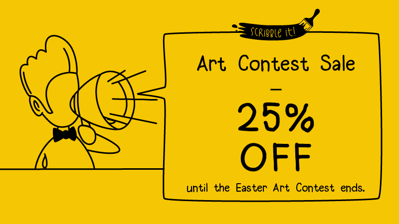 What? Easter Art Contest When? Live now. Deadline: 15.04.2021 6 PM/18.00 CET How? Draw Scribbles, upload to Steam workshop, post link on our Discord server Why? Win prizes like Steam Gift Cards, Game Keys and the prestigious Contest Winner Discord Role