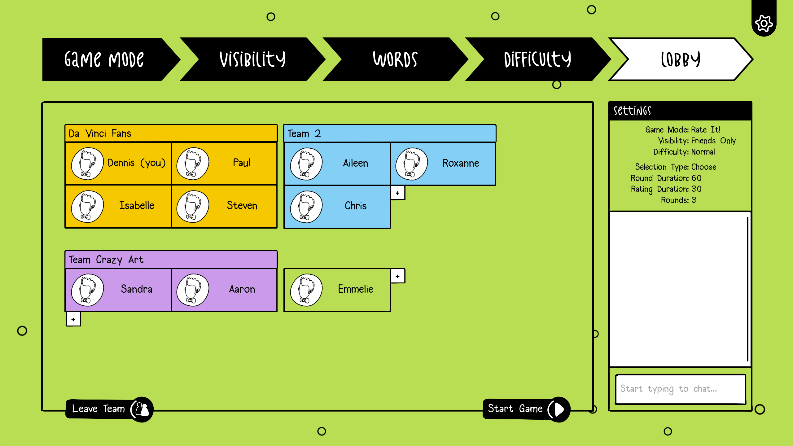 From now on you can play with teams of up to 4 players. This is possible in all game modes. You do not have to create teams which means playing solo like before is still possible. Any combination of team sizes from 1-4 can play against each other. Drawing together on a single scribble needs some practice and might be a tough challenge at first but that's what makes it fun!