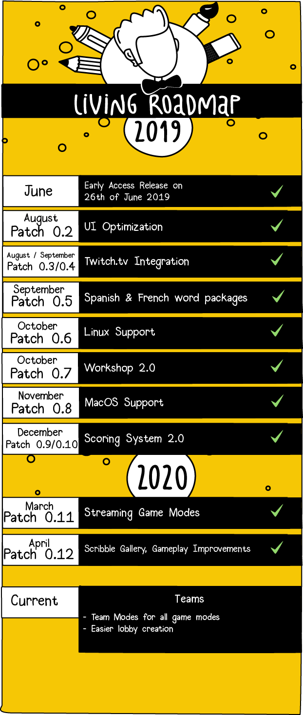 With the release all players will be able to play Scribble It! for free with a limited feature set. All current features will be unlockable via DLC, which will be a bit cheaper than the current version of the game. Every player that already owns the game when we leave Early Access will of course receive the DLC for free, as well as a little bonus. The official release will also come with another game update. Patch-Notes for that update will be released when the patch is live.