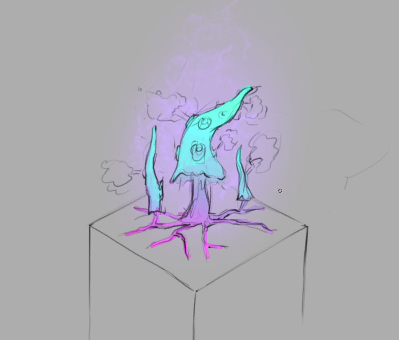 But because we wanted for it to work similarly to our Dmg booster aura (click on it to activate it for a limited period of time) we had to add a mechanism that ‘forces’ the mushroom to emit those gasses. Quick sketches for ways it could work.