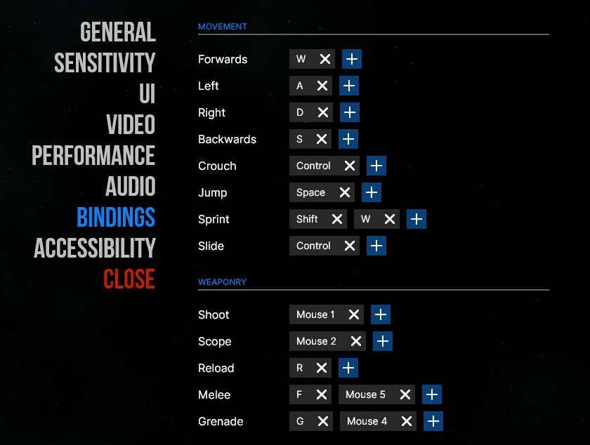 You can now also create bindings with Control / Alt / Shift combinations, and the default Toggle UI / Chat / Fullscreen bindings can now be removed.