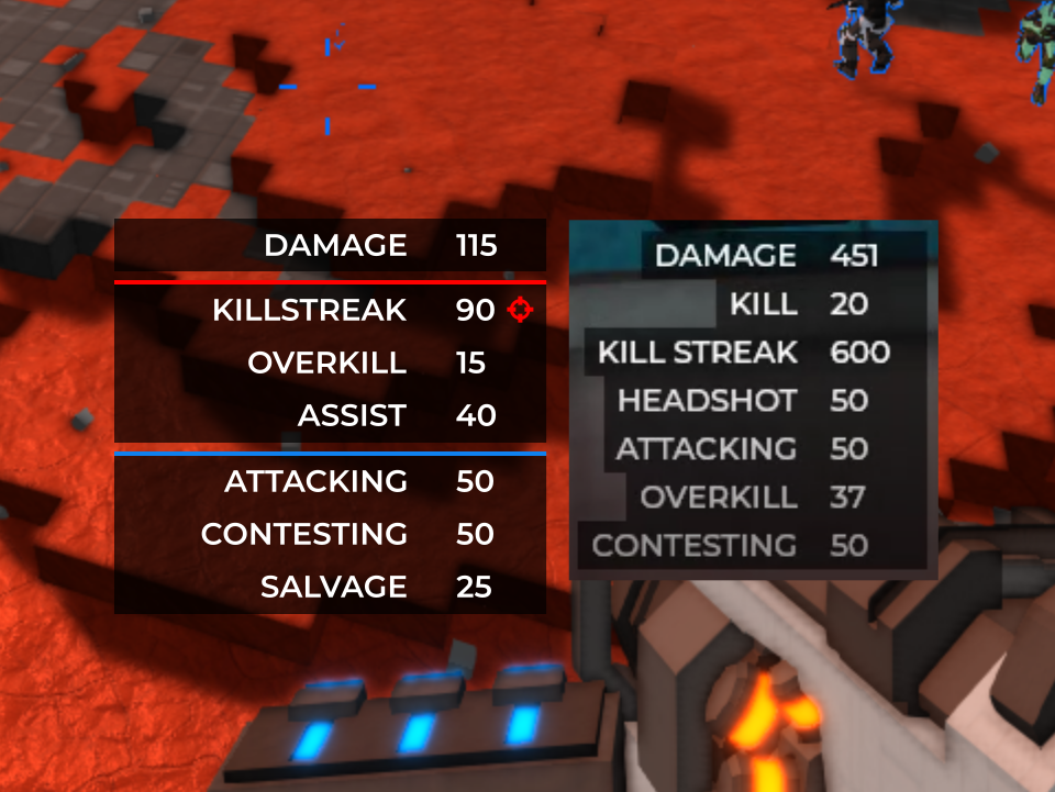 Lately I noticed that the points UI in-game appears quite spammy, especially when killing multiple players in a row. I decided to clean this up with a few changes: - KILL / KILLSTREAK / HEADSHOT / DIRECT points will accumulate together and a red icon will show on the right if it's a headshot/direct kill. This line will always either say KILL or KILLSTREAK - All point types will accumulate together, i.e. rather than showing ATTACKING 50 twice, they will be combined together and say ATTACKING 100 - The point UI is split into two sections: Primary (red bar at the top) and Secondary (blue bar at the top) categories