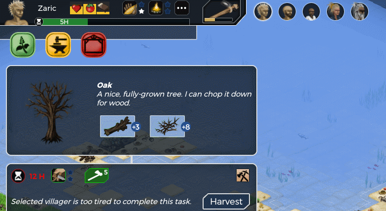 Harvesting and recycling stuff on the map is way quicker. You don’t have to select the right tab anymore! Say you are on the crafting tab and you just lack one branch to complete an axe recipe, you can simply click on a sapling to obtain a branch, and then click on the craft button.