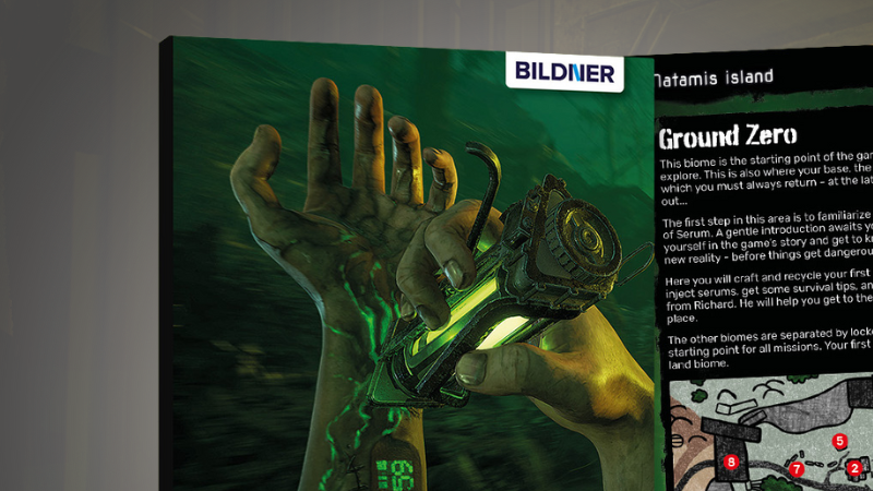 The guide contains detailed descriptions of the island of Matamis , its biomes, and the many dangers that lurk there. You will also find valuable combat and hunting tips, crafting and insights on recycling, as well as instructions on how to set traps to protect yourself from the island‘s threats.