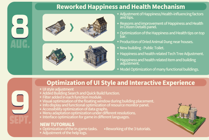 Reworked Happiness and Health Mechanism :This part has been elaborated in DevLog #1 so we just put it here concisely, that is, we’ve overhauled the HH mechanism. Although we have paid enormous development cost, and players need to adjust themselves to the new HH mechanism, we still think it is a worthy change after our consideration.