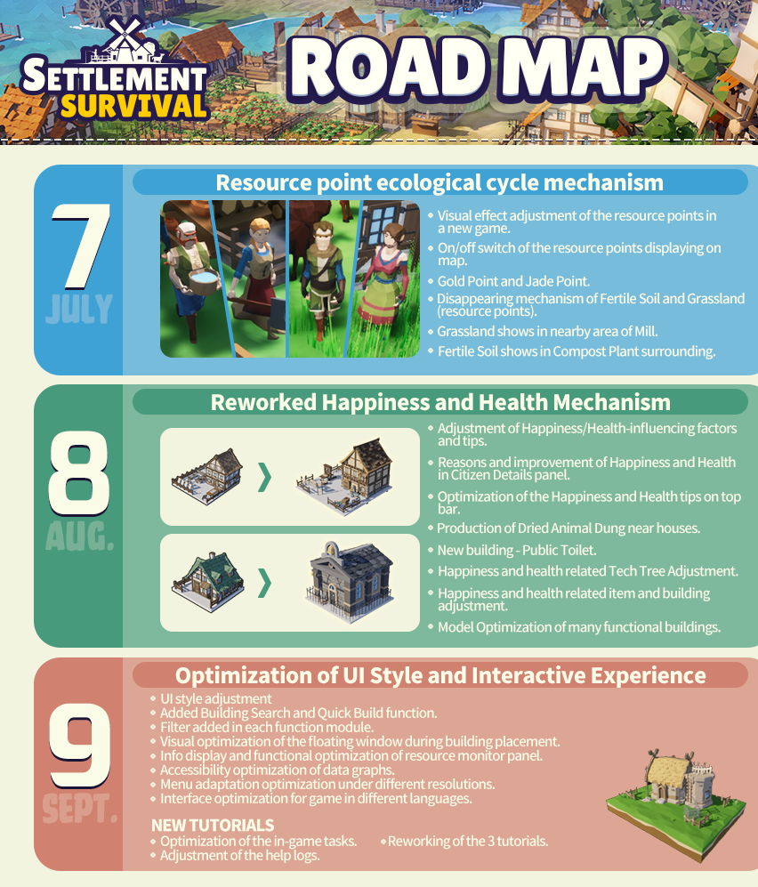 New Tourism Industry:Think about it. Your well-planned towns and cities attract many travelers here. They are enjoying the beautiful view and consuming the tasty food and drinks. You have to satisfy all sorts of needs for these travelers such as accommodation, food, drinks, medical treatment and transport and protect them from dangerous animals. And finally, after they leave, you have to clean up the mess they leave behind and those travelers will just spread your town name to places far far away, either in a good way or bad way... Alright, this content will not be up till next year, it may be a DLC but every player can access to this extra content freely.