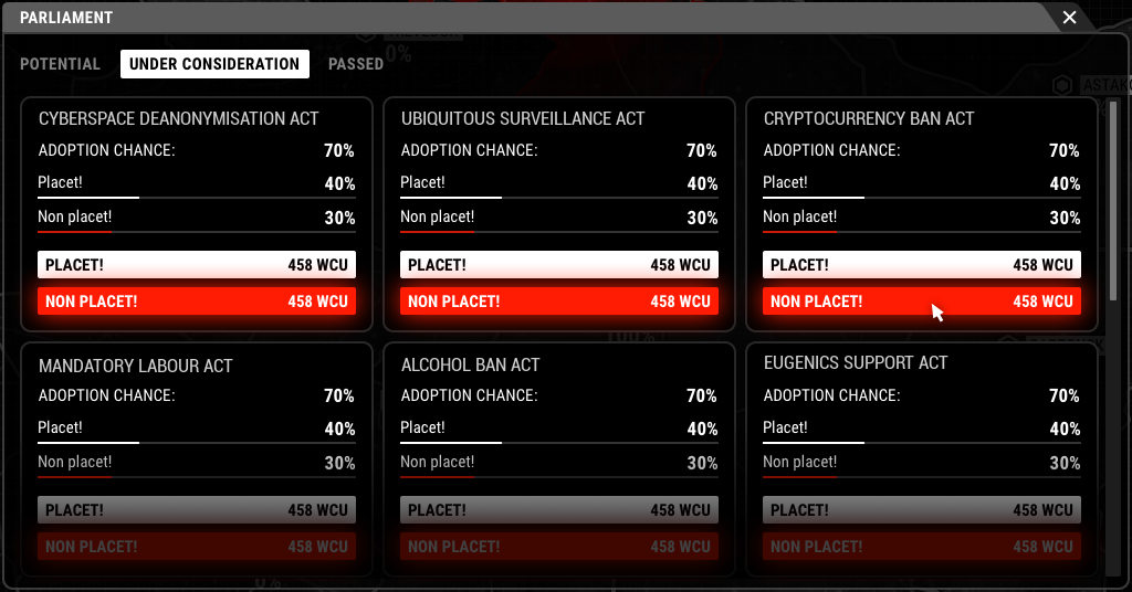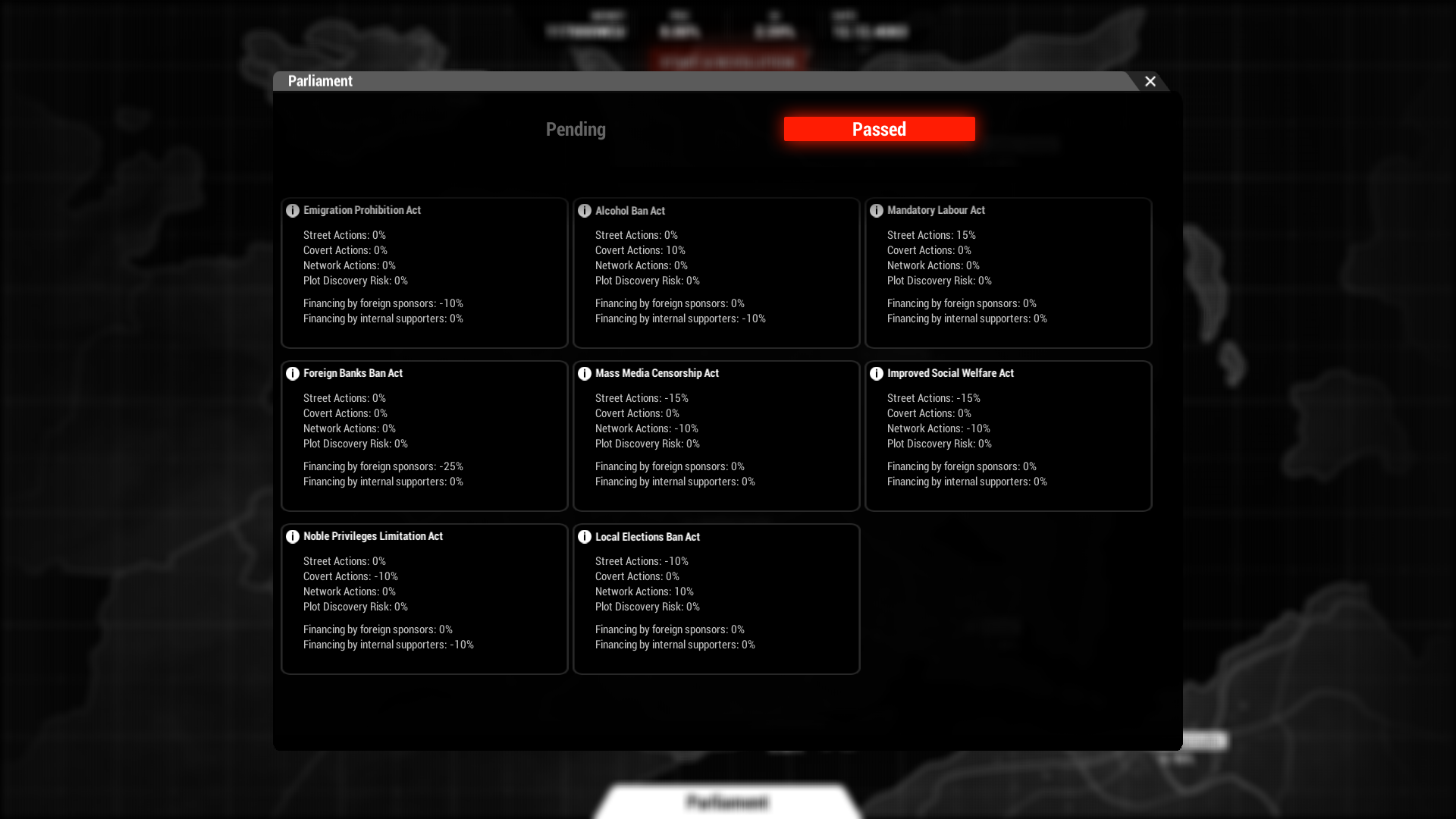The Parliament passes laws that have a different impact on the situation in the country. Some laws reduce tensions in the empire, some others increase it, and some laws provide additional obstacles to your clandestine activities. By bribing politicians, you will be able to lobby for the adoption of laws that meet your interests, and the abolition of those that hinder your rush to revolution.