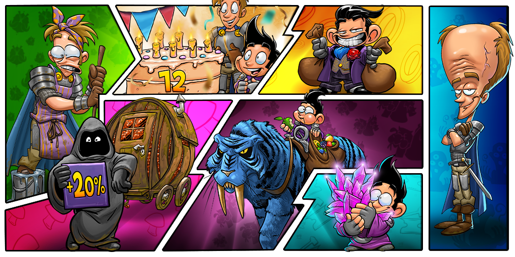 In order to celebrate Shakes & Fidget's birthday week in style, we will have a special BIRTHDAY COMBINATION of events with +20% more mushrooms at the dealer, more XP, more gold, more blacksmith resources and more points for dismantling items, more mana points in the Arcane Toilet, more pet food and faster mounts from Friday to Sunday!