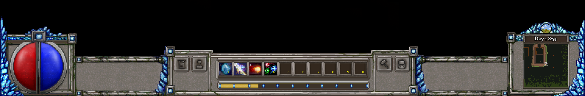 - The health and mana bars are now in the bottom left. - The experience bar has now shifted centrally and under the action bar. - Certain things have been cleaned or omitted in the redesigning - such as the Character Profile/Name and Extra Strikes.