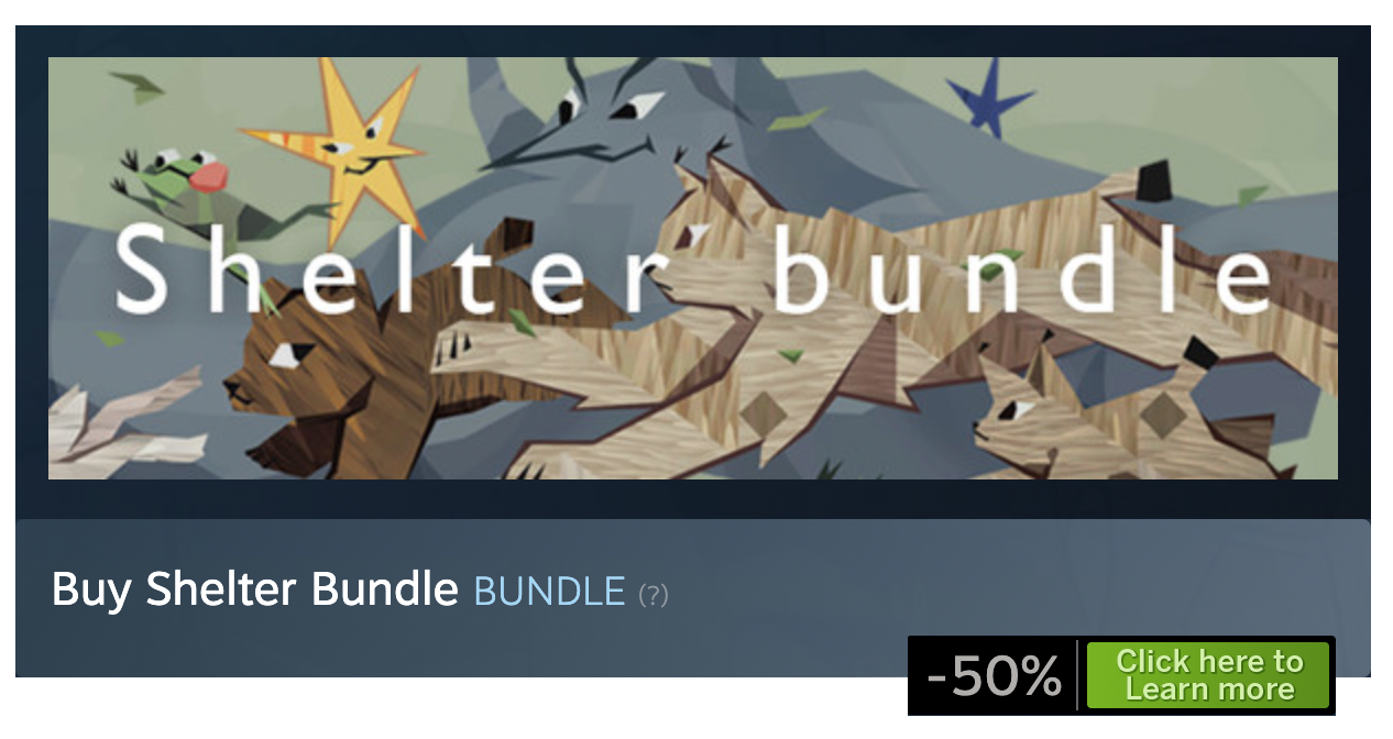 PS. We've made a bundle with all the released games and DLCs in the Shelter Universe – it unlocks lots of skins, sounds and emotes in Meadow, and comes with a 50% discount – you can check it out here: