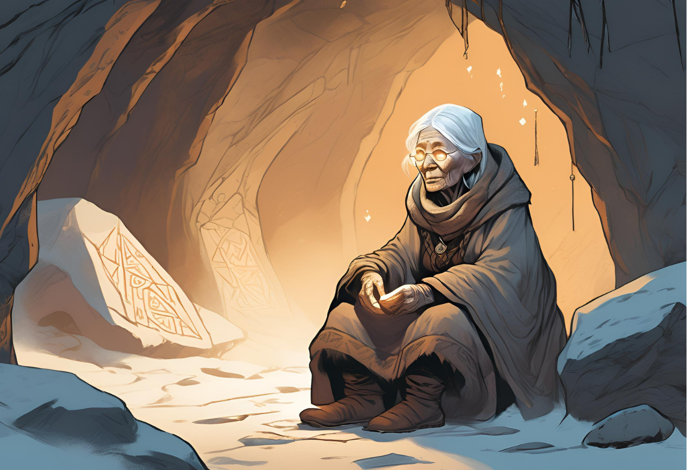 The journey to the ice desert was as treacherous as the warnings had foretold. Aglovan and his companions pushed forward against the biting cold, their breath forming misty clouds in the frigid air. At last, nestled in a remote cavern, they found the one they sought—a frail woman, her eyes as white as the snow outside, yet filled with an unsettling knowing.