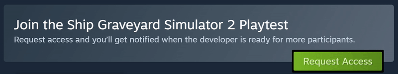 1. Login to your Steam account 2. Go to the Ship Graveyard Simulator 2 Steam page 3. Scroll a little lower on the page 4. You will see the banner like below, and click the green button "request access"