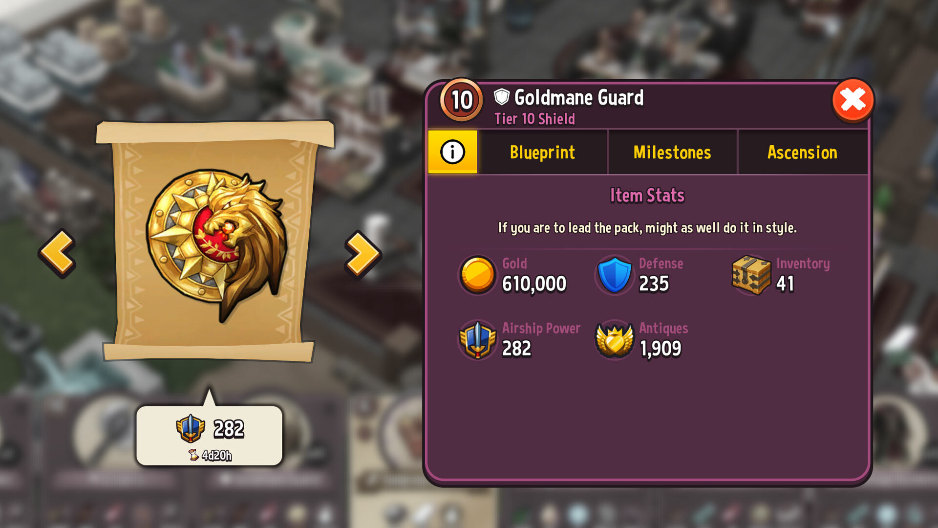 We followed up on a widely requested feature and reworked the blueprint details screen to include a new tab showcasing the Airship Power for Dragon Invasion and Favor value for King’s Caprice, even if those events aren’t currently active. We also took this opportunity to move over other item stats previously hidden behind a tooltip to this new tab.