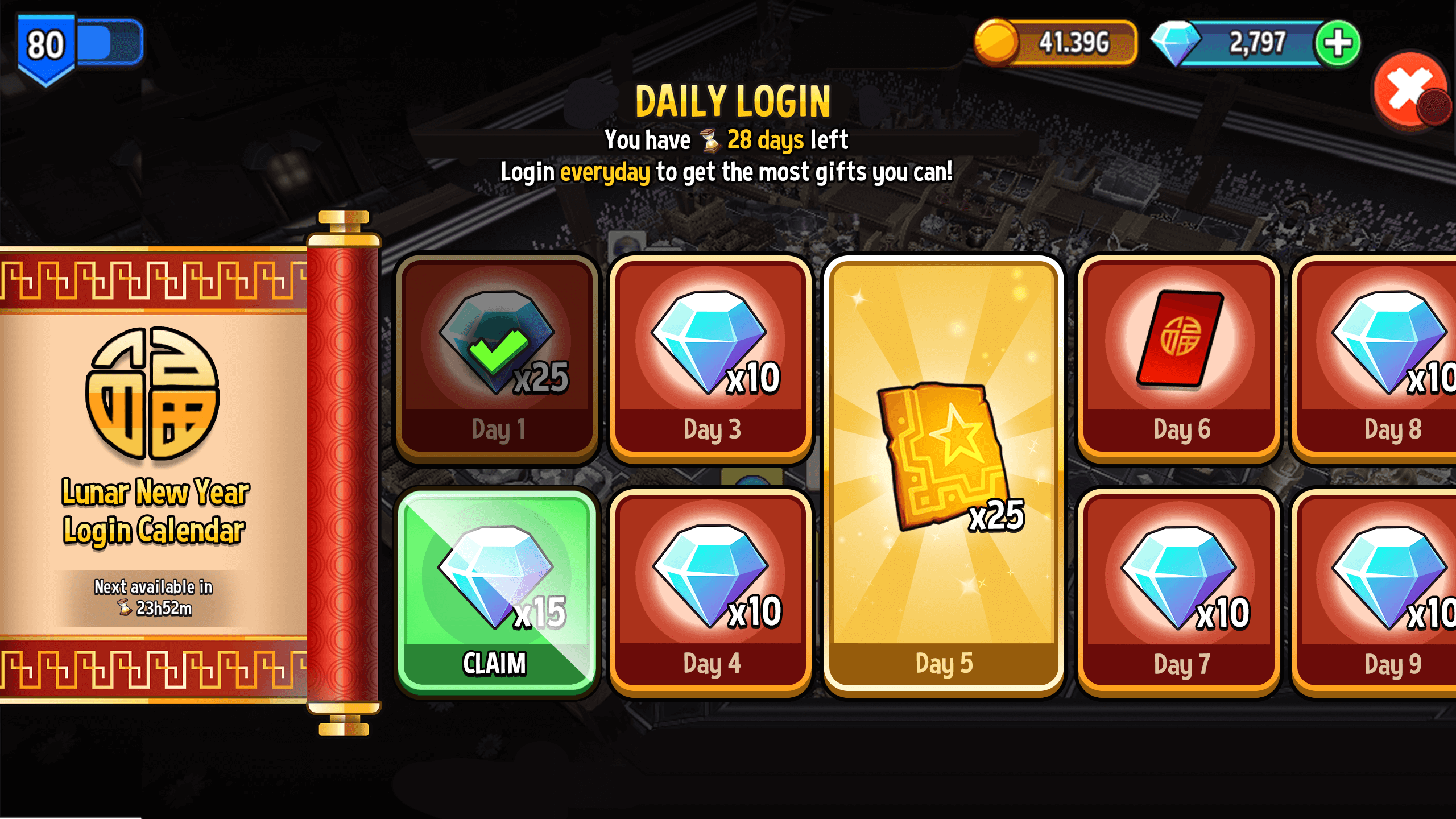 For display purposes only. Not indicative of actual rewards. It’s time for our yearly red envelopes! Login every day between January 23rd and February 11th to claim rewards!