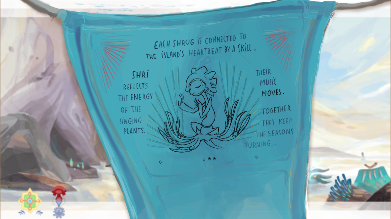 Shri’s gift is to take the form of their surroundings at special locations shown by the Glow Plants. Transformed, Shri can channel five musical notes from the plant that will move nearby pieces of the Island.