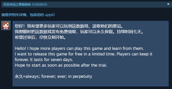 话不多嗦,希望领取的朋友可以试玩一下给点意见评论。 我会督促开发者一条条仔细阅读。 开始时间仍然以STEAM过审时间为准。 祝游戏愉快! I don't want to be wordy. I hope my friends can have a try and comment. I will urge developers to read it carefully. The start time is still subject to the time of steam review. Happy game!