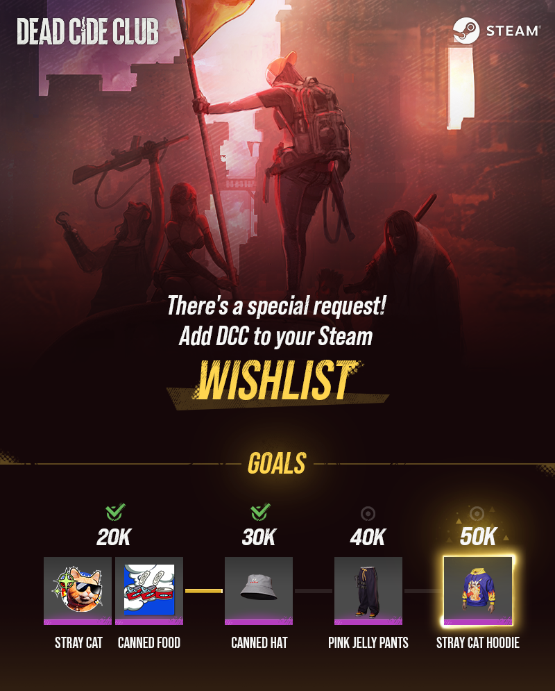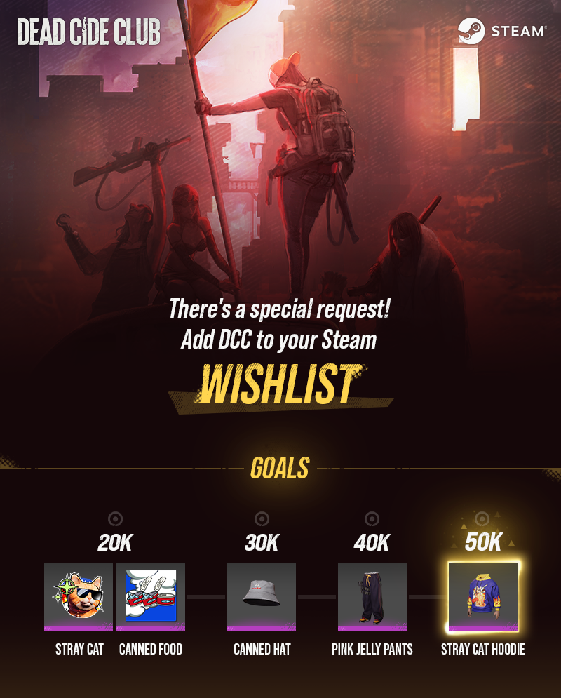 All you need to do is add DEAD CIDE CLUB to your Steam wishlist. Depending on how many wishlist entries DCC gets, we will be giving out special in-game rewards to you. So add the game to your wishlist now and secure your first costume set to get started!