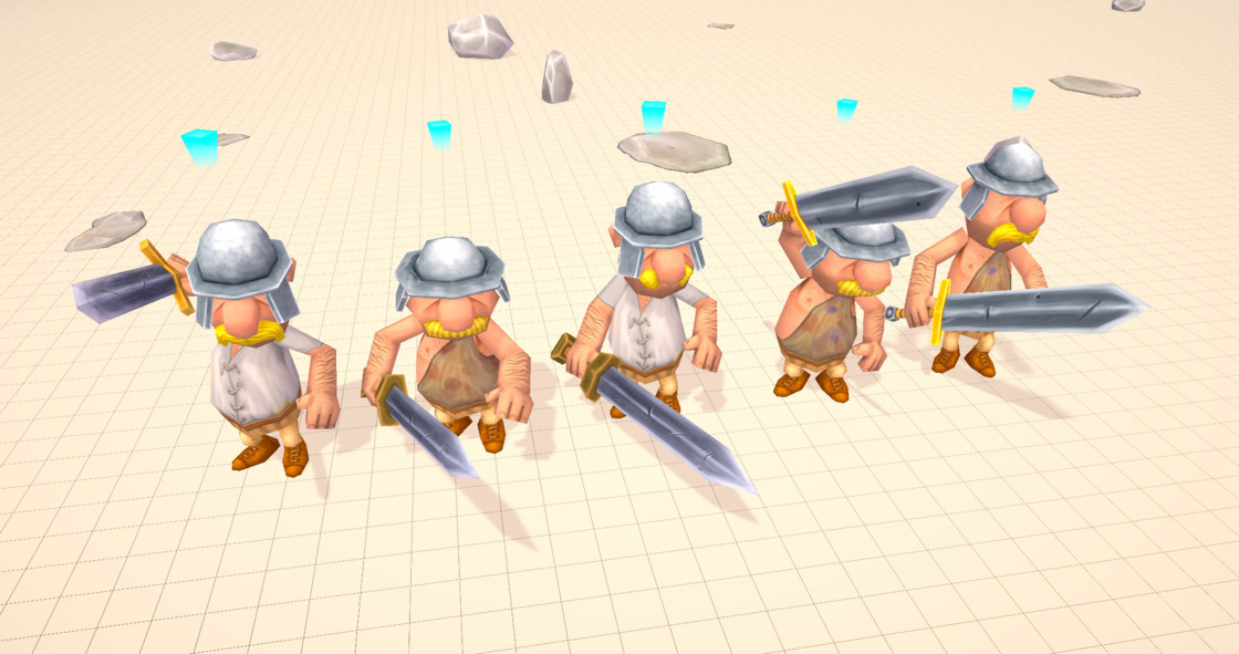 At this point the game has 6 types of units. All have their own animations and textures (with some overlap). To make them appear different and organic they also have different looking equipment and accessories.