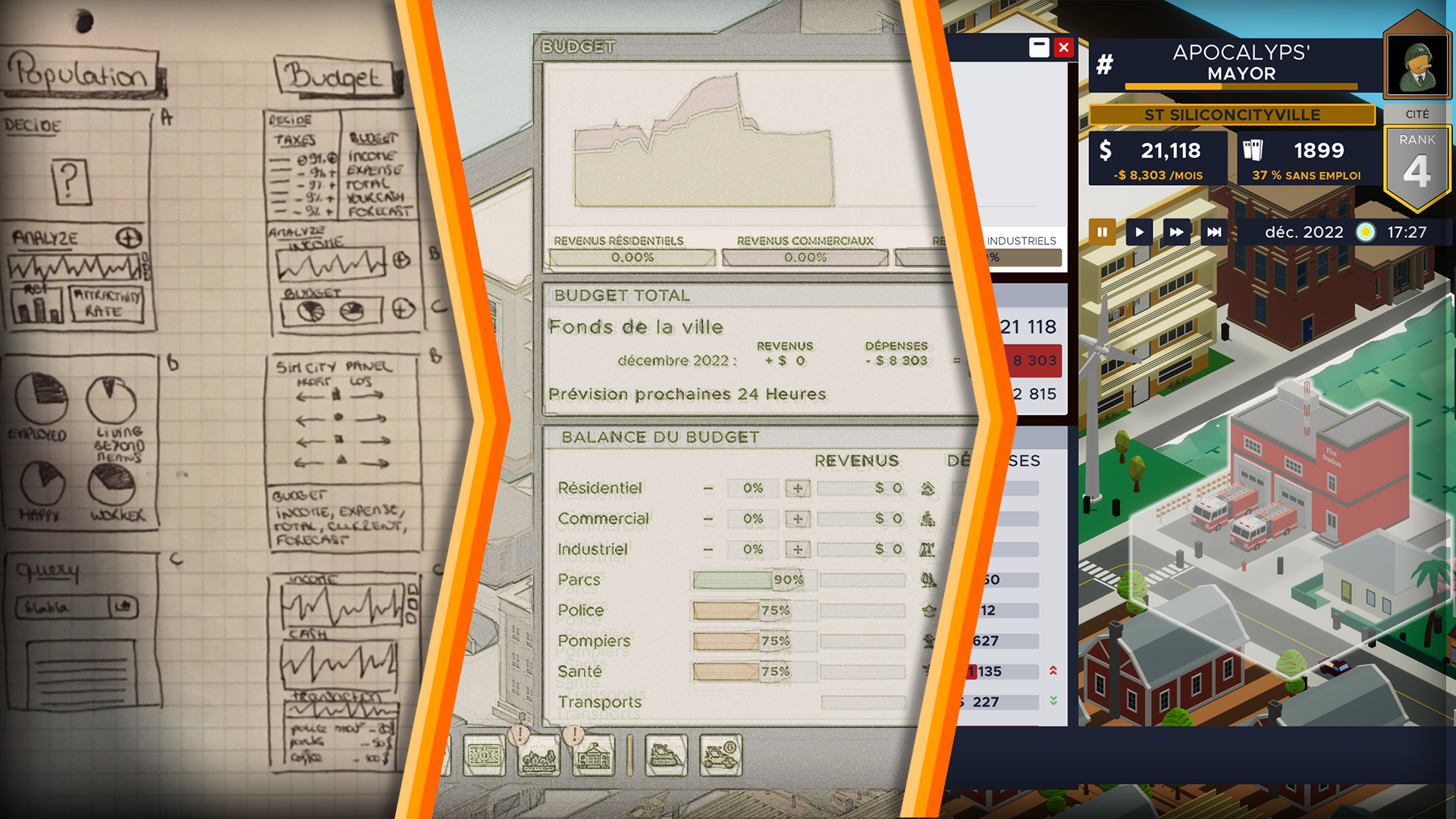 Building a quality user interface is a process that requires maturation for a development studio. This update is by far the most significant improvement we've made to Silicon City for the small Polycorne team! Almost twelve months ago, our lead UX designer Léa Medrano started the first drafts of this interface. Today we are proud of the colors given to the game and of this integration, along with the updates made since.