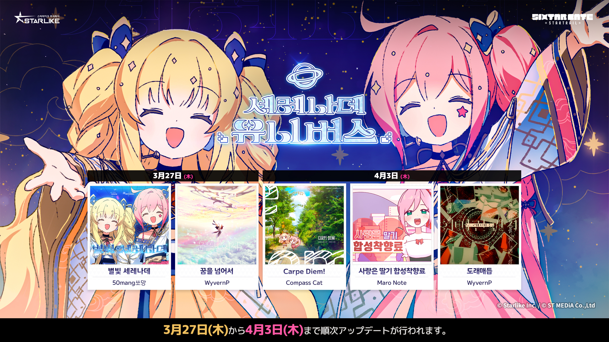 ★ New song updated! 5 new songs with SERENADE UNIVERSE theme song will be updated sequentially. - 2025.03.27 tracks 「50mang - 별빛 세레나데」 「WyvernP - 꿈을 넘어서」