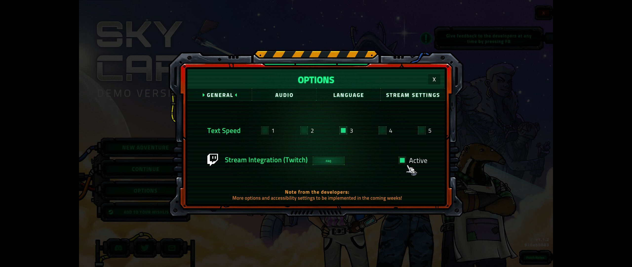 - On Sky Caravan's main menu (or, alternatively, the pause menu), go to Options, then mark the checkbox labeled Twitch Integration.