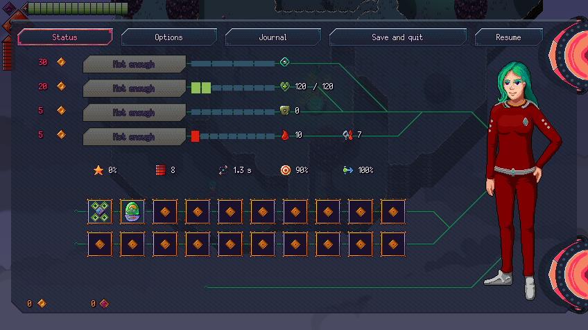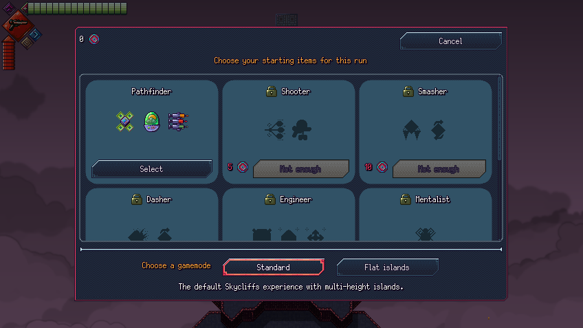 Skycliffs has a very simple meta progression system (I want the game to be more roguelike than roguelite). Similarly to games like Faster Than Light or Spelunky, all items and special quests can appear from the get-go. The meta aspect only consists of a class system where you can start runs with various presets. However, I was not entirely happy with two points of this system: