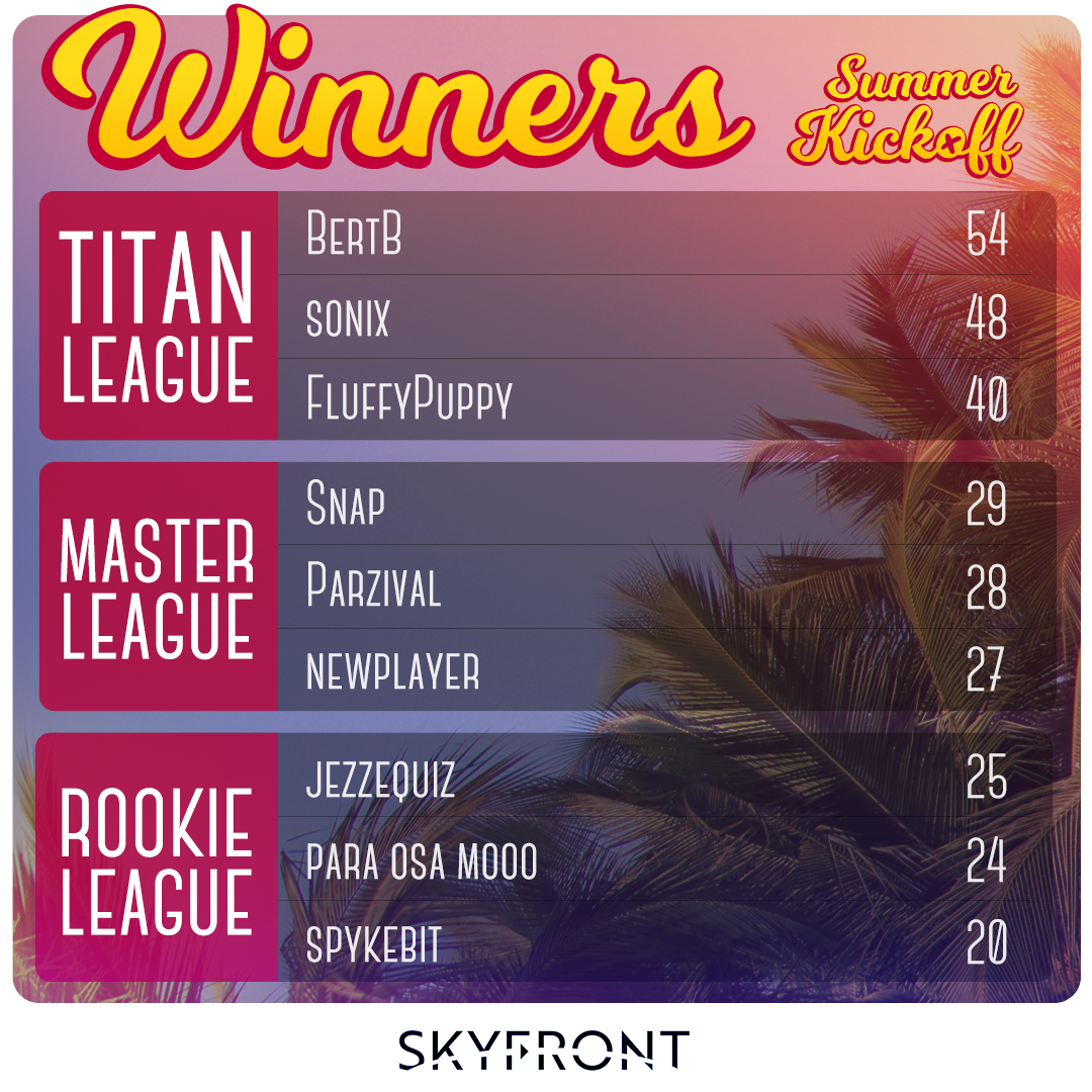 Skyfront will attempt to contact the winners of the Summer Kickoff Challenge, but to guarantee that you get your due prize asap, please contact the devs on Skyfront’s social media or Discord channel.