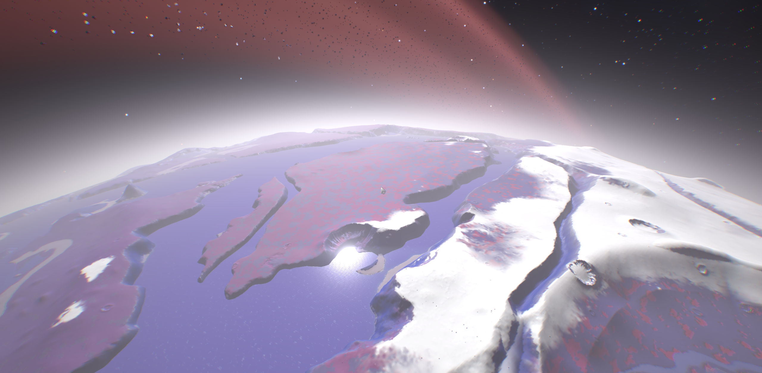 some plants have a faded look trees have a weird satin look. The terrain shader have been optimized - but I will try to add a graphic toggle for people who struggle with FPS on planet. Many texture samples are needed and it is quite a bottleneck at the moment. If you have low-perf GPU please answer to this thread I will follow-up with you to improve the performance.