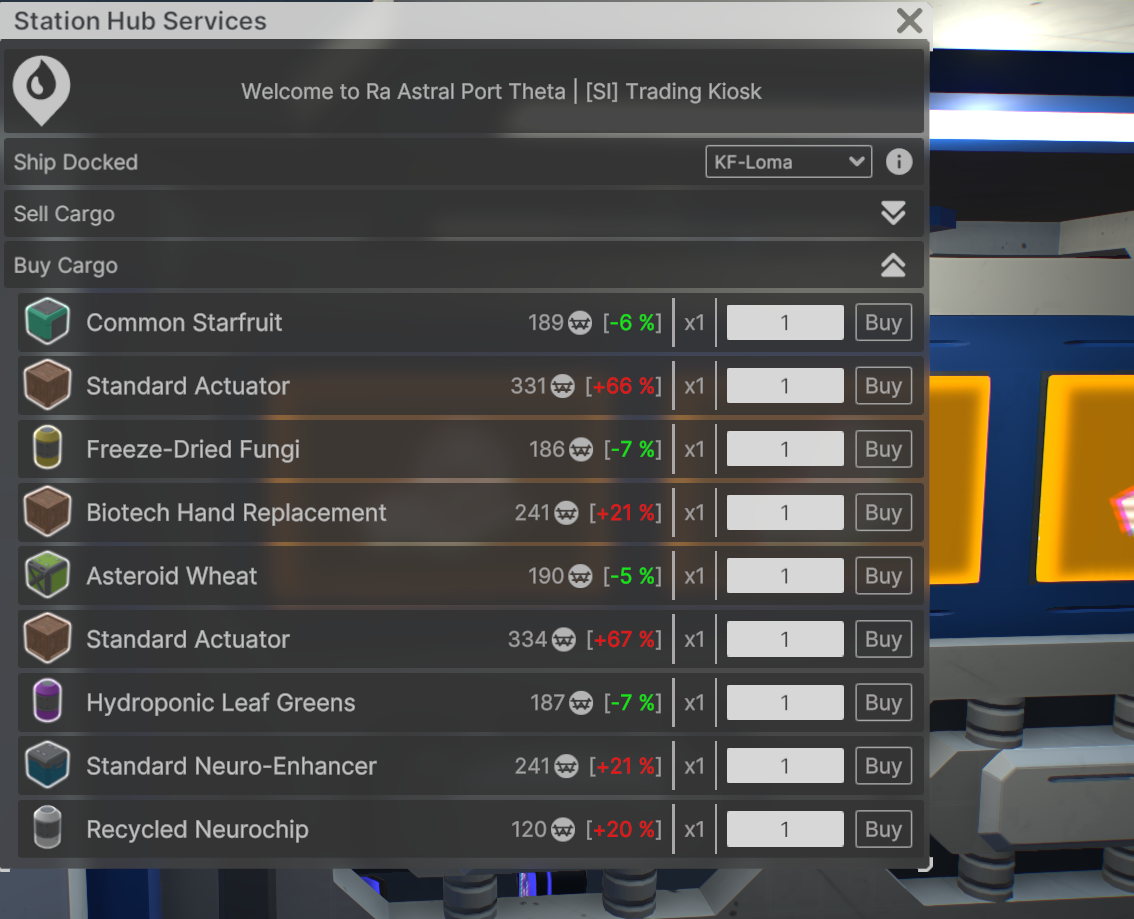 Trader ship, Cargo cache or Trading Kiosks will now offer a trading menu.
